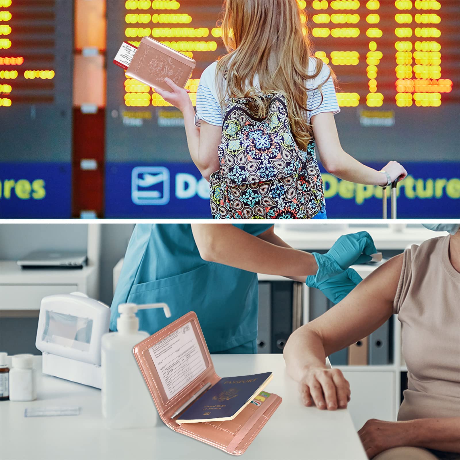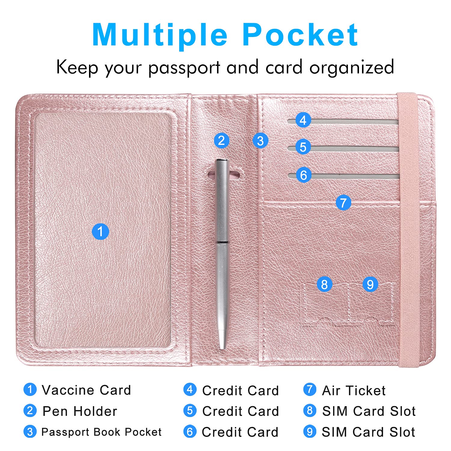 - PROTECT YOU FROM INFORMATION THEFT: Information theft through RFID chips is a growing issue. Our passport holder with vaccine card slot will protect you from this. this RFID passport holder is equipped with advanced RFID blocking technology. Our passport and vaccine card holder has a unique material engineered specifically to block 13.56 MHz or higher RFID signals and protect the valuable information stored on your passport and credit cards from unauthorized scans.