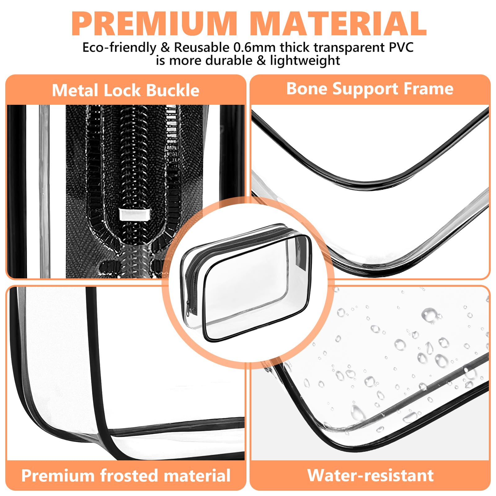 - ✈✈✈【Improved zipper & Waterproof】Improved zipper head makes it smoother. Clear toiletries pouch prevents your small bottles and water from messing up your entire luggage if they happen to leak. Waterproof PVC material makes it easier to clean, and scratch-resistant, and any stains on it can be easily wiped off with a towel.
