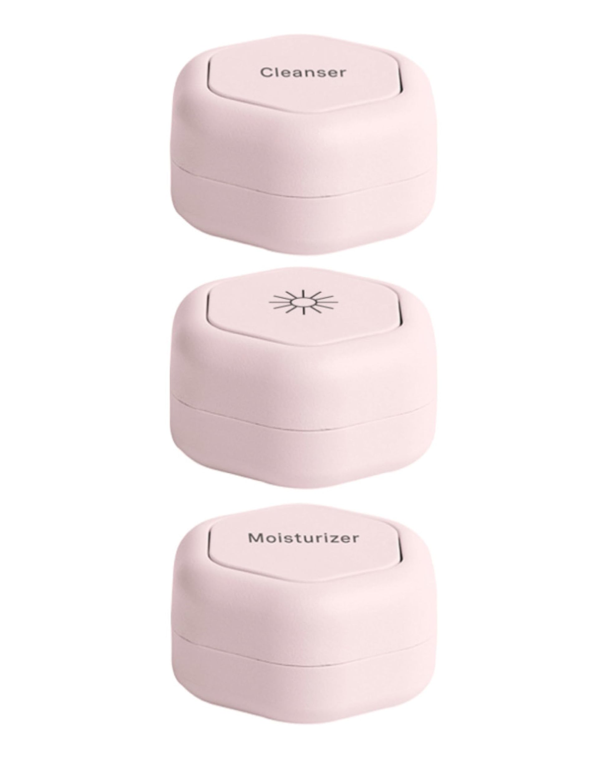 Cadence Travel Containers - Skincare Set - Magnetic Travel Capsules - for Facial Cleanser, Moisturizer, Sunscreen - 3 Medium Capsules (0.56oz) with Cleanser, Moisturizer & Sun-Icon Labels - Petal