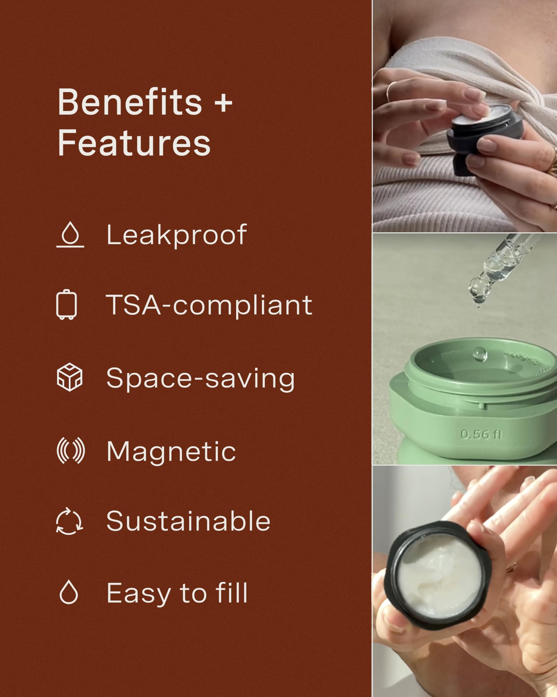 - INNOVATIVE MAGNETIC DESIGN: Our travel skincare capsules feature a magnetic design that connects each container vertically or horizontally. They include magnetic labels that seamlessly swap between Small, Medium, and Large Capsules.