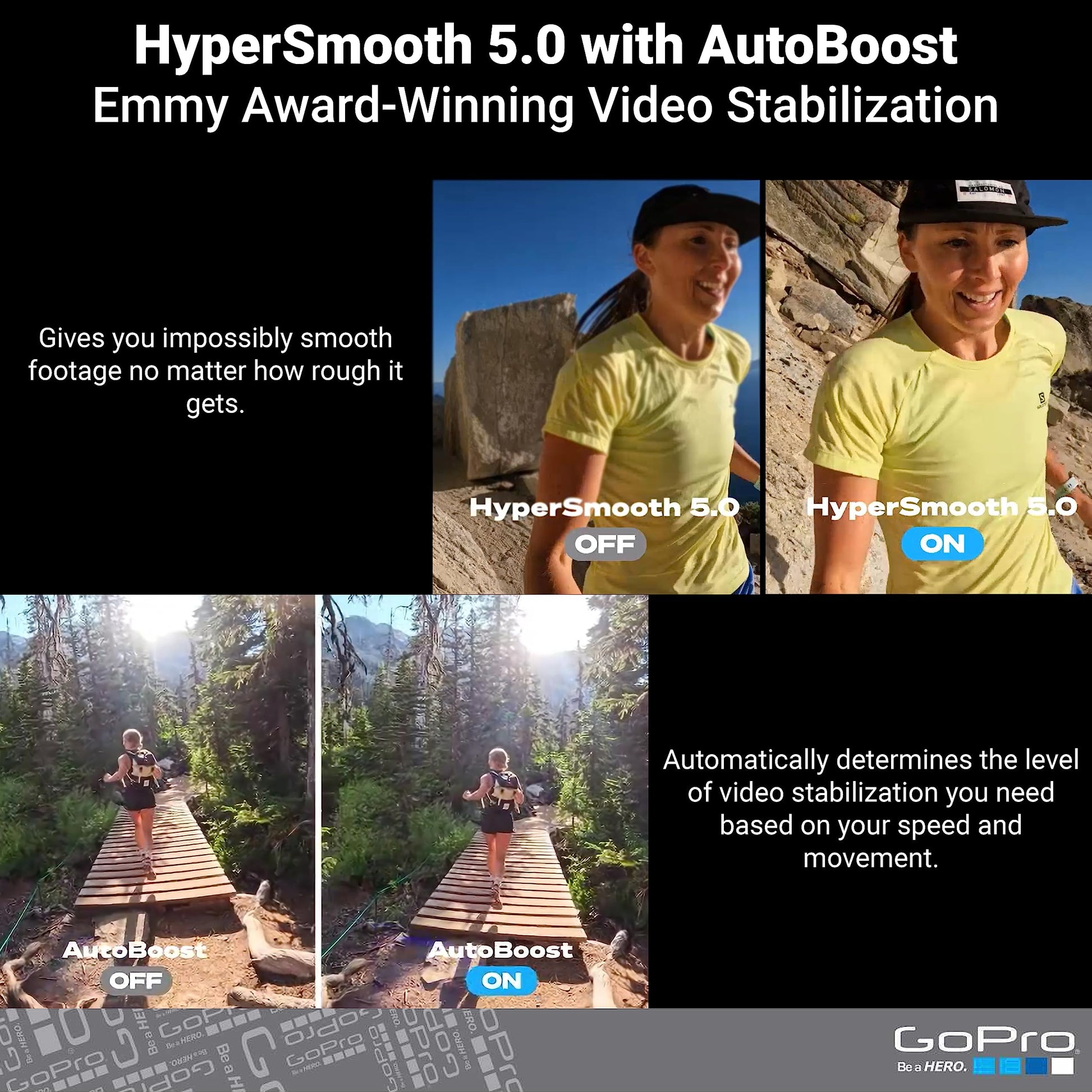 - Emmy Award-Winning HyperSmooth Stabilization: HyperSmooth has never been better, winning an Emmy in 2021 for its In-Camera Sensor and Software Stabilization. HyperSmooth 5.0 raises the bar with Horizon Lock improved stabilization for 4:3 aspect ratio footage thanks to our new image sensor and AutoBoost for maximum stabilization with minimal image cropping.
