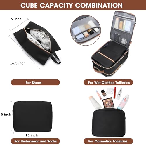 - 🩸3 Extra Packing Cubes & Wet Pockets - This airport carry on backpack comes with 1 shoe bag, 2 storage bag, One cube bag for toiletries such as makeup, cleanser, etc. One cube bag for underwear, socks, and small clothes neatly inside. The shoe bag is 16.5 inches/42cm long and can hold 1~2 pair of shoes. The built-in dry and wet separation bag to keep your things organized, and you do not worry making your backpack wet. Personal item travel bag convenient for your all travel things.