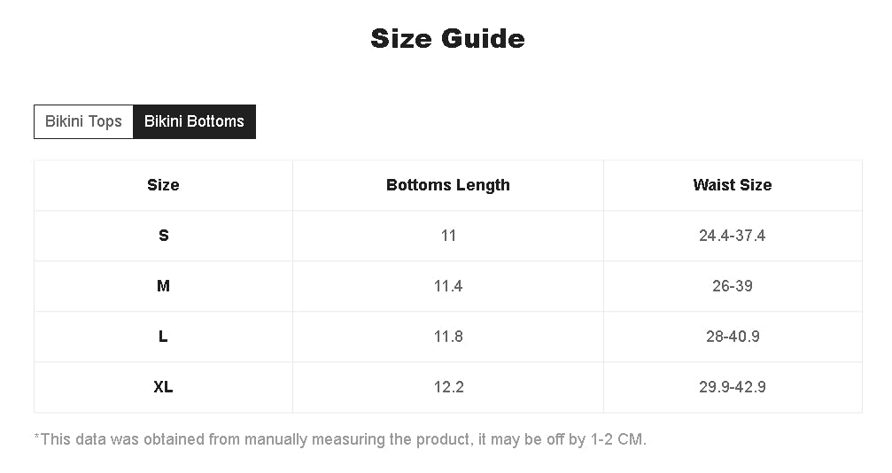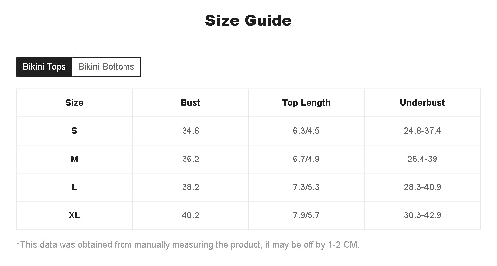 Small: Bust: 34.6", Top Length: 6.3/4.5", Underbust: 24.8-37.4", Bottoms Length: 11.0", Waist Size: 24.4-37.4"