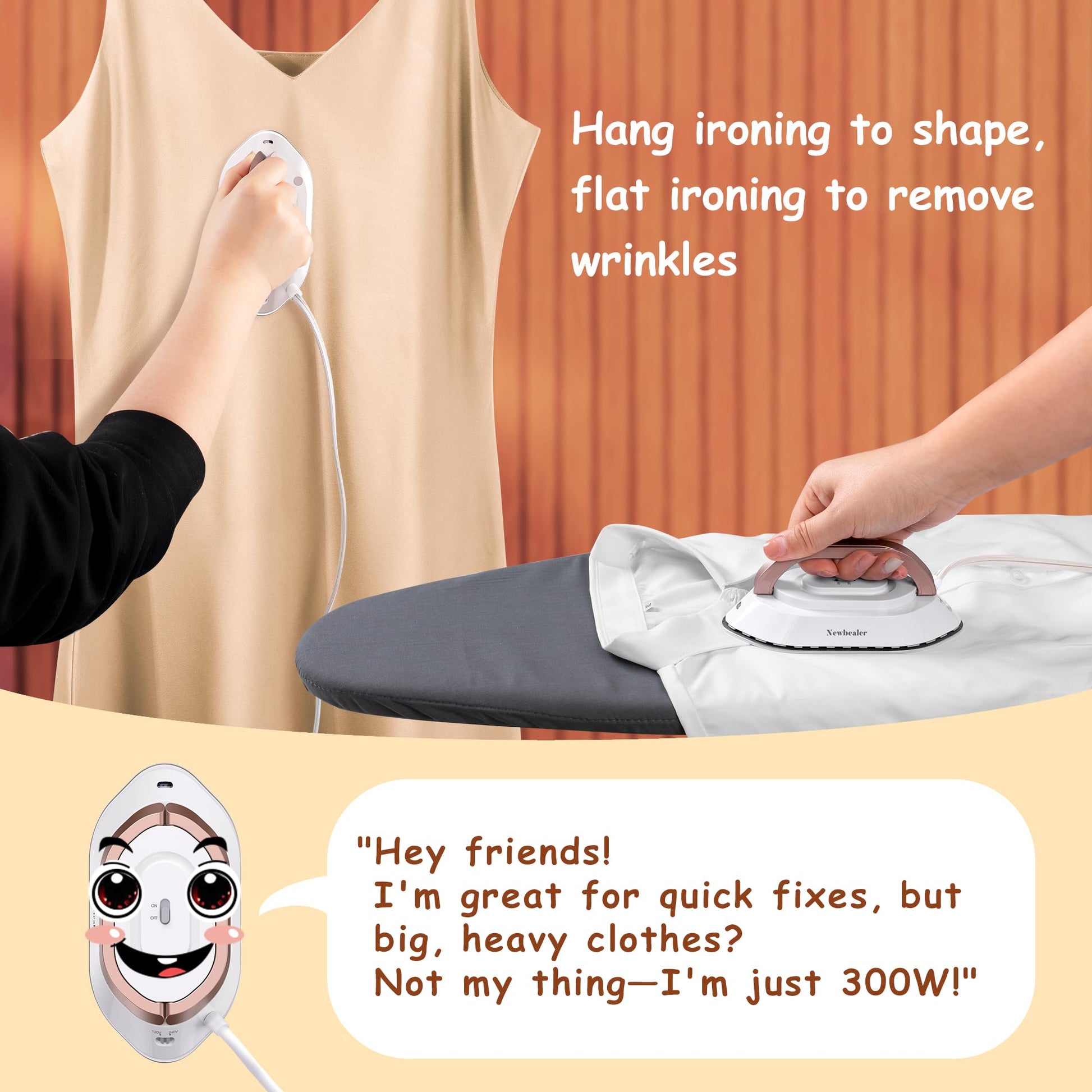 - 【100-240V Dual Voltage, Ideal for Travel】The mini iron is designed with a dual-voltage switch, which allows you to bring it anywhere worldwide. 300 watts of power removes wrinkles from almost any fabric for photo-worthy outfits. When traveling abroad, just select between 100 and 240 volts, and prepare the plug adapter in advance!