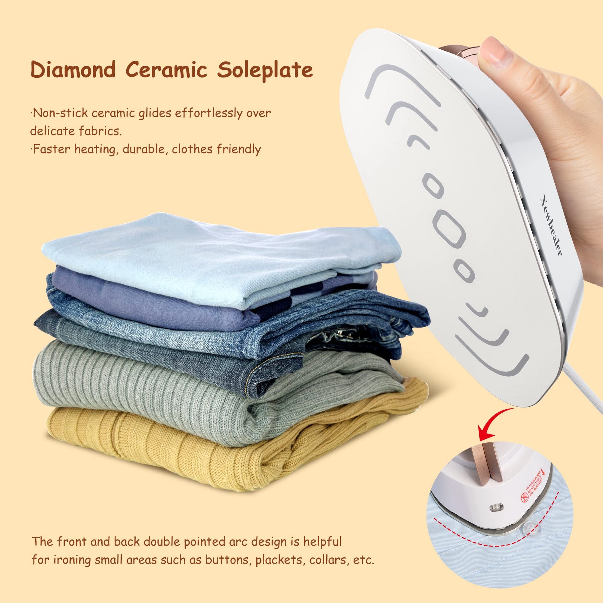 - 【Nonstick Ceramic Soleplate】The portable travel iron adopts Diamond Coated ceramic soleplate, which conducts heat quickly and more scratch-resistant than stainless steel plates. Easy cleaning smooth surface, glides effortlessly over delicate fabrics. The front and back double pointed arc design is helpful for ironing small areas such as buttons, plackets, collars, etc.