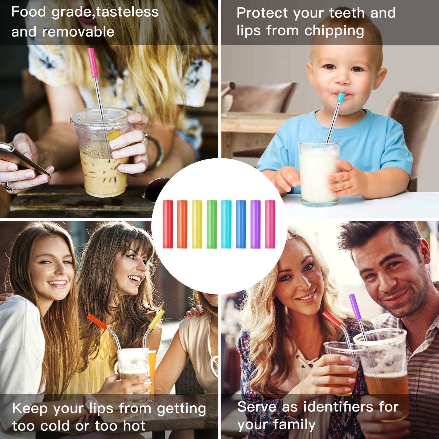 - 【Awesome Accessories】SILICONE COVERS - They keep your lips from getting too cold or too hot and protect your teeth and lips from chipping.There are eight different silicone top colors to serve as identifiers for your family. SCRUB BRUSHES - With the 2 extra long 9.5" cleaner,you can clean the inside of the recyclable straws from top to bottom easily.PORTABLE CARRYING POUCH – This kit includes a helpful travel case so you can bring some of your reusable straw with you on the go.
