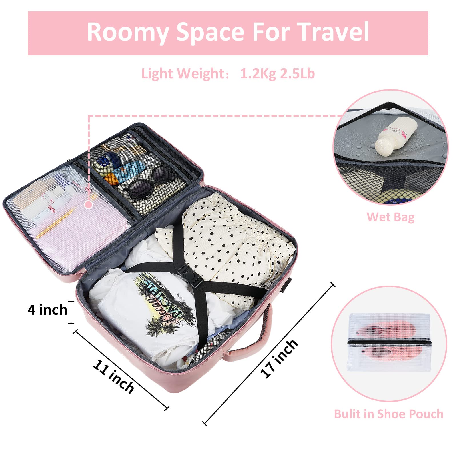 - Roomy Capacity & Multi-Pocket: Dimensions 17*11*7inch, Light Weight 1.2Kg(2.5lb), has 3 main large compartments and 9 allocated inner pockets and side pockets. Makes your item organized and easier to find. College laptop bookbag backpack with laptop compartment holds a 17 inch laptop and a 12.9 iPad, pink travel backpack providing a dedicated space for your pen, textbooks, wallet, clothes, shoes, bottle and other travel essentials. At the same time,travel backpack carry on is slightly waterproof