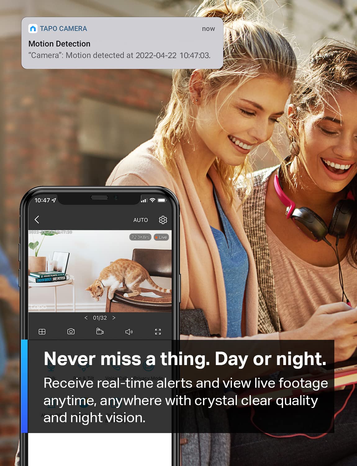 Details: Protect your home with the Tapo C100 smart indoor security camera Wi-Fi. Featuring crystal-clear 1080P high-definition video, it captures every detail inside your home. Receive instant push notifications when motion, a person, or baby crying is detected from this baby camera monitor, all without additional fees. Monitor your home day and night with up to 30ft of night vision using the integrated IR sensor. Utilize the 2-way audio with a built-in siren to use as a pet camera with the phone app and deter intruders. Fully compatible with Amazon Alexa and Google Assistant, simply use voice commands to view the Tapo indoor security camera live stream on Echo Show or Google Chromecast with a screen. Store footage continuously on a microSD card up to 512 GB (not included) or subscribe to Tapo Care for cloud storage, offering a 30-day video history and additional benefits such as motion tracking and baby crying detection. [Before purchasing a microSD card, please check the TP-Link website FAQ to ensure compatibility with your device.]