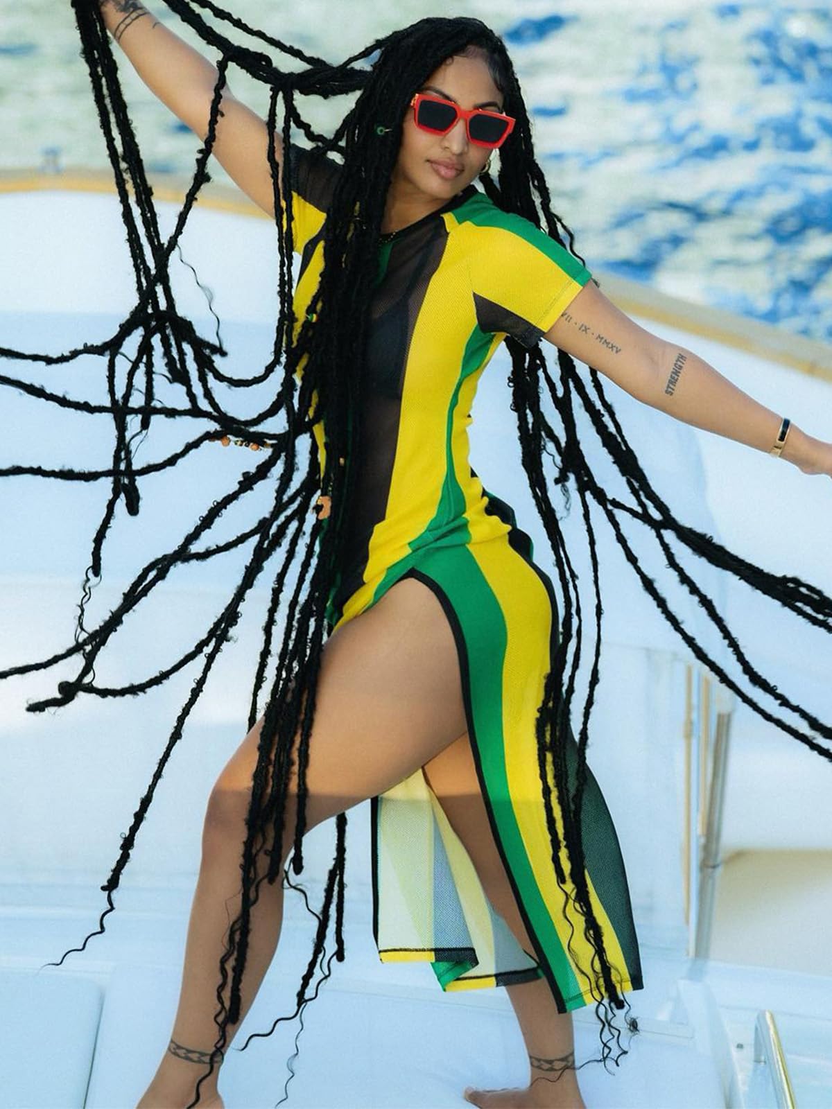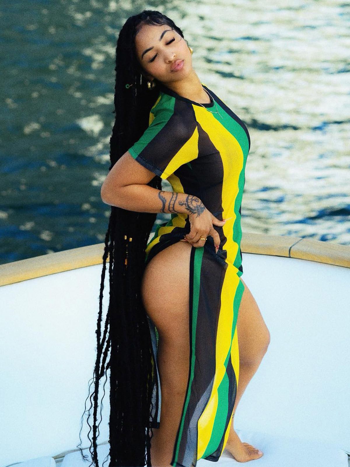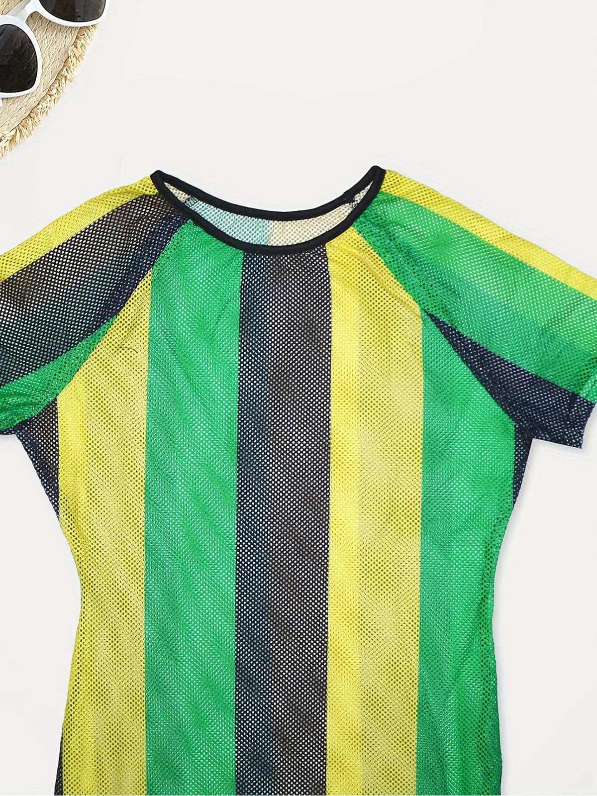 - 【Features】Jamaica flag stripe print, round collar, short sleeve, double side high split, above knee length/mid calf length, fishnet hollow out, perspective design swimsuits cover ups.